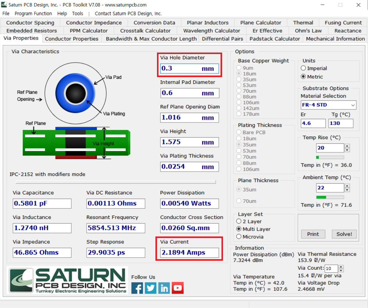 프로그램을 확인하면 VIA 홀 사이즈가 0.3mm일 때, 2.1894A라고 나오게 됩니다.