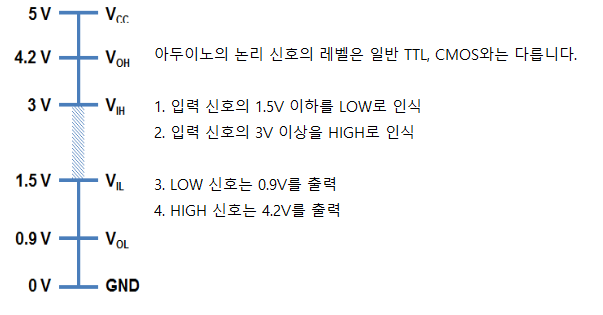 5V 전원을 사용하는 아두이노 보드의 로직레벨에 대한 전압 크기는 다음과 같습니다.