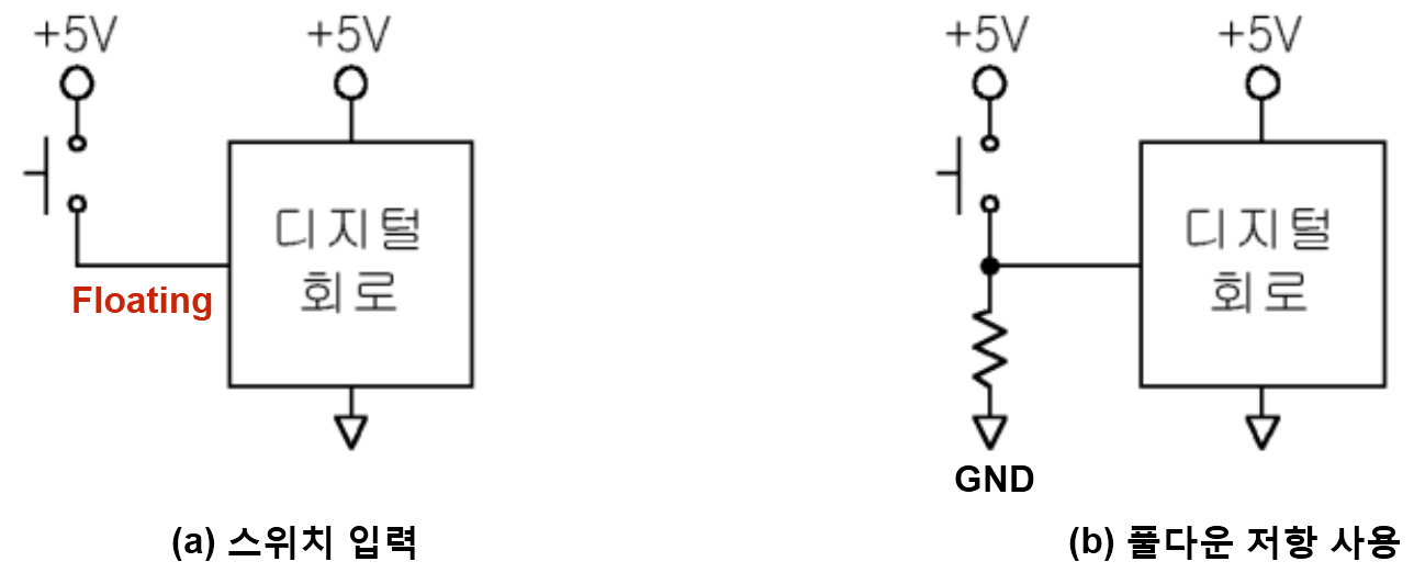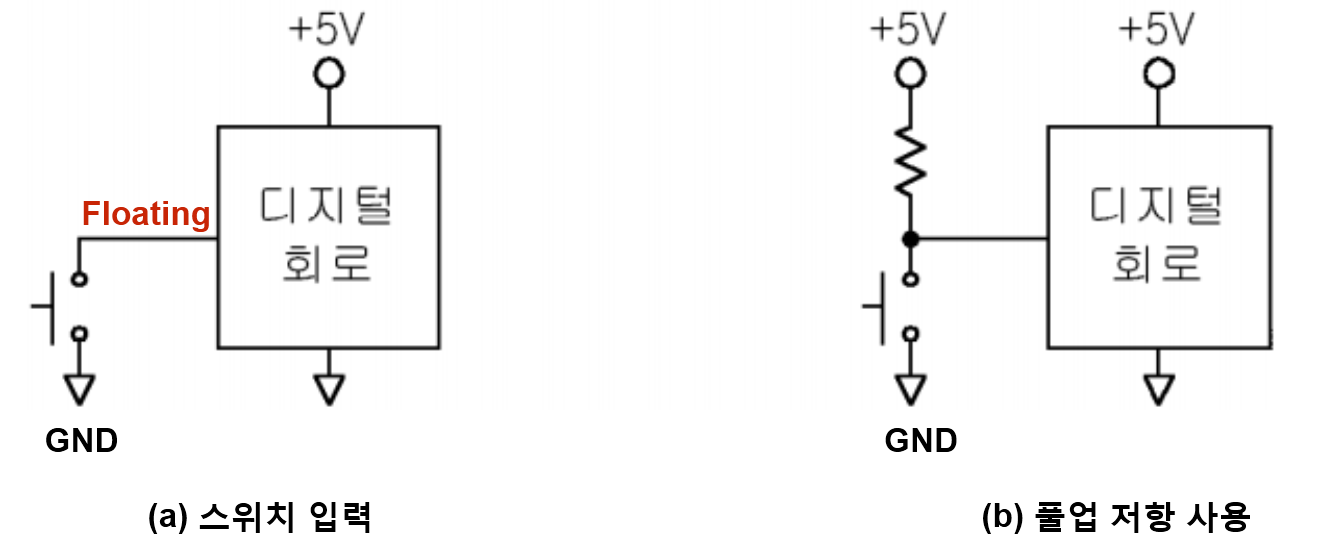 오른쪽 회로(b)처럼 풀업을 부착하면 스위치가 눌리지 않으면 '1'이 되고, 스위치가 눌리면 '0'이 됩니다.