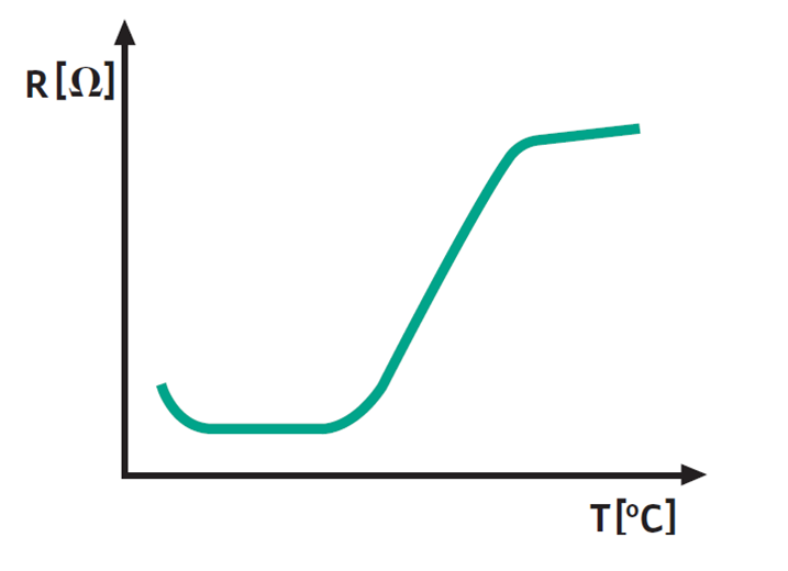 아래 그래프와 같이 상온(25도)에서는 저항 값이 매우 낮으며, 일정 온도 이상이 되면 저항값이 굉장히 높아집니다.