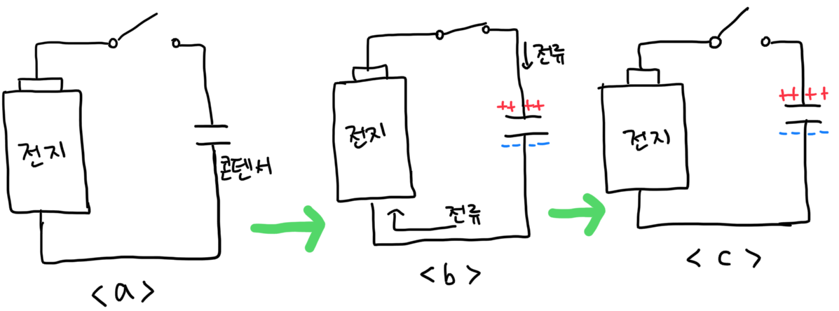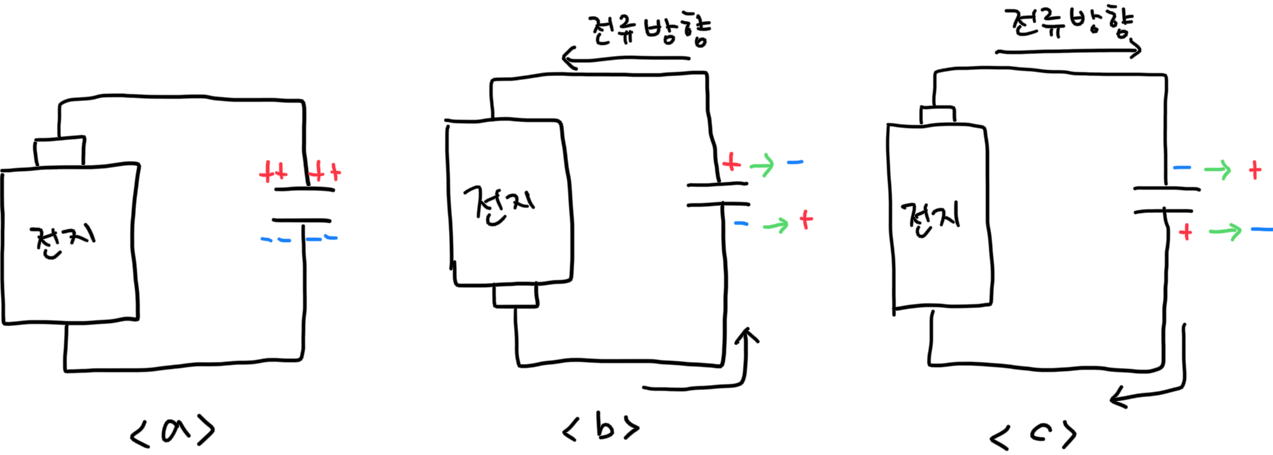 <그림 a>는 콘덴서가 완전 충전이 된 상태입니다. 이 상태에서 전지를 거꾸로 연결하면 어떻게 될까요??