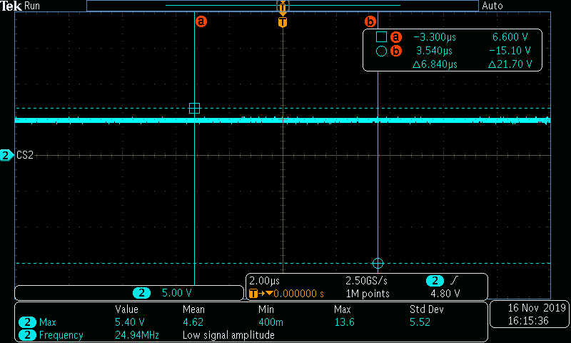 5. 다시 전원 ON 후 오실로스코프로 파형 측정 (파형이 Ready와 steady 상태를 반복했음.)