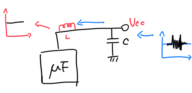 위 회로를 참고하면, 대부분의 노이즈는 디커플링 콘덴서를 거쳐 제거가 되지만, 완전히 제거되지 않을 경우가 있습니다.