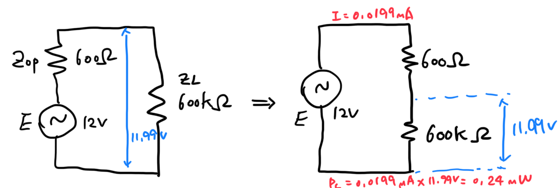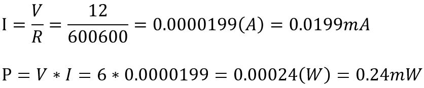 그리고 부하 600kΩ의 양끝 전압이 11.99V이므로 전력은 0.24mW가 되네요.