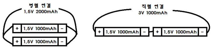 아래 이미지를 참고하시면 직렬과 병렬연결일 때, 용량이 어떻게 되는지 알 수 있어요.