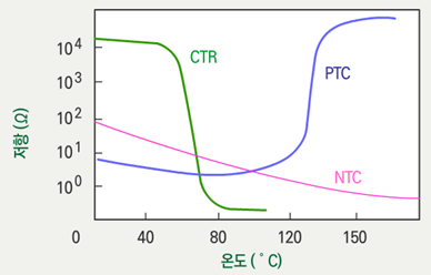 좀 더 깊게 말씀드리면, NTC는 마이너스 계수를 가지고, PTC는 양의 계수를 가져요. 그리고 CTR은 NTC와 유사하지만 특정 온도 범위에서 갑자기 저항치가 감소해요.