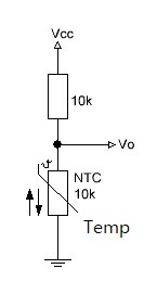 NTC와 MCU를 함께 사용하는 방법은 위 회로와 같이 저항 분압을 이용해서 많이 사용해요. 전압 Vcc는 대략 3.3V, 5V를 많이 사용해요.